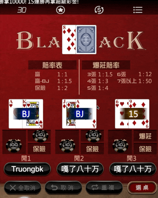 8.牌型大小順序依次為:八張勝出>BJ>21點>普通牌型。